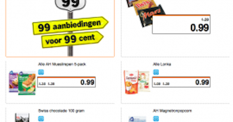 Albert Heijn a lancé aux Pays-Bas une nouvelle action répondant au nom de Route 99 et au slogan "La voie la plus avantageuse" (De voordeligste route van Nederland). Durant les deux prochaines semaines, 99 produits seront mis en ventes pour 99 cents. Cette semaine par exemple, le shampooing Nivea Repair habituellement au prix de 2,46 € sera vendu 0,99 €. La semaines prochaine, 99 autres produits connaîtront le même type de réduction.